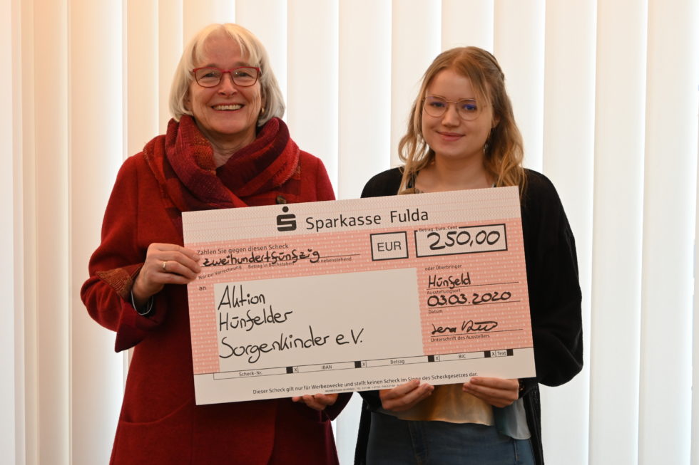 Einen Scheck in Höhe von 250 Euro konnte Lena Kaiser von den Stadtwerken Hünfeld GmbH an die Vorsitzende der Aktion Hünfelder Sorgenkinder, Rita Fennel, übergeben. Das Geld wurde unter den Mitarbeitern des Hünfelder Versorgungsunternehmens gesammelt. Nach den Worten von Lena Kaiser spenden die Beschäftigten in jedem Jahr zugunsten einer sozialen Einrichtung oder eines Vereins vor Ort. Auf der Betriebsversammlung seien sich die Mitarbeiter einig gewesen, das Geld in diesem Jahr der Aktion Hünfelder Sorgenkinder zur Verfügung zu stellen.